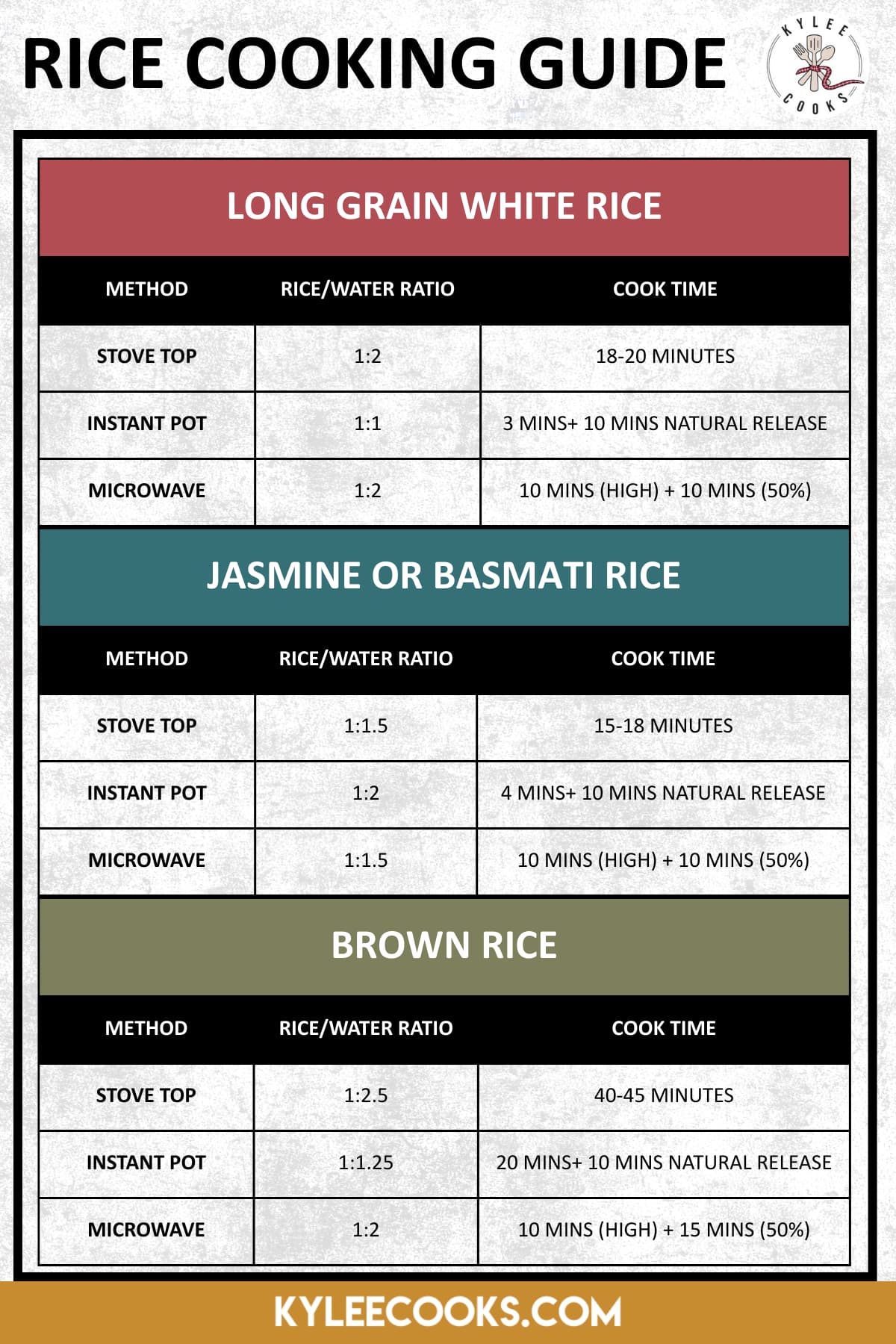 Below is a quick breakdown by rice type and cooking method. Scroll back up to the graphic anytime you need a visual cheat sheet.