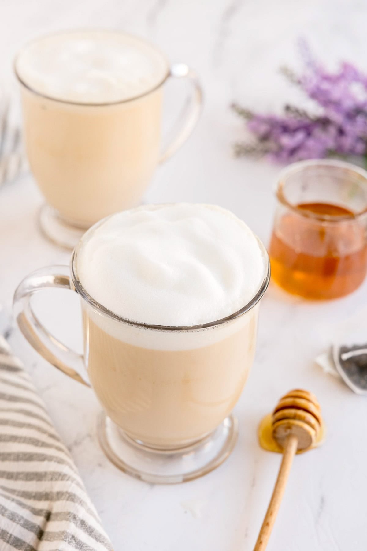 Froth the milk if you want a thick, foamy top. If you don’t want to measure vanilla and honey separately, vanilla syrup works great here.